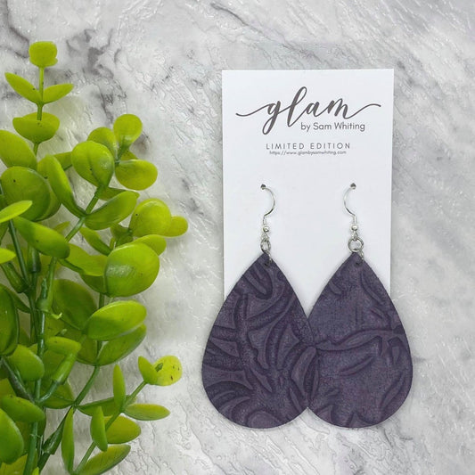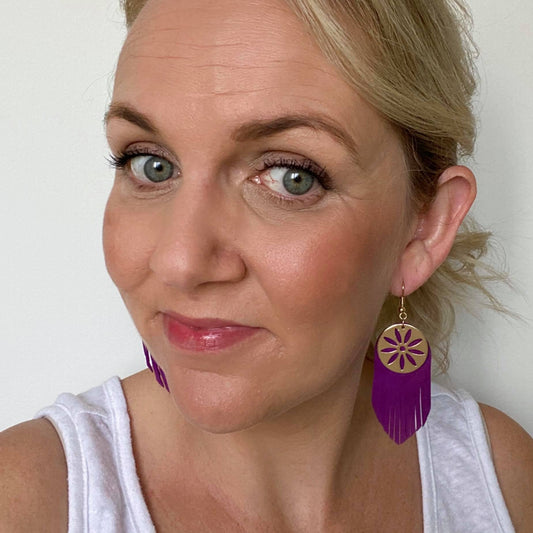 Purple Fringe & Gold Coin // Metal & Leather Earrings