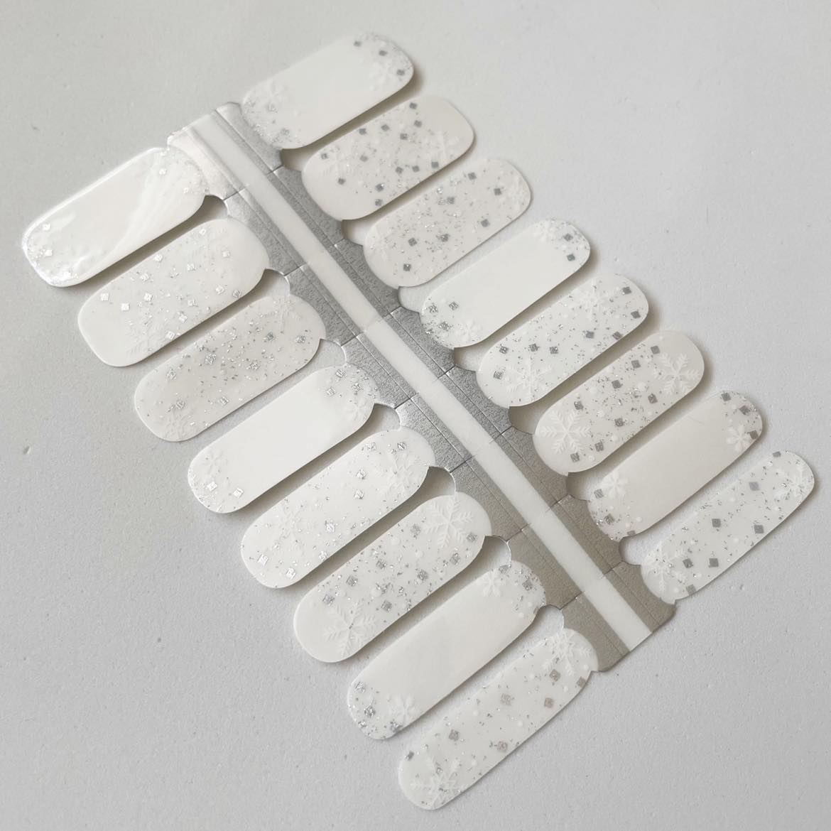 A transparent and glitter print manicure design nail polish strip. Suitable for natural, shellac, acrylic, and gel nails. 100% real nail polish, non-toxic, vegan friendly, and cruelty-free.