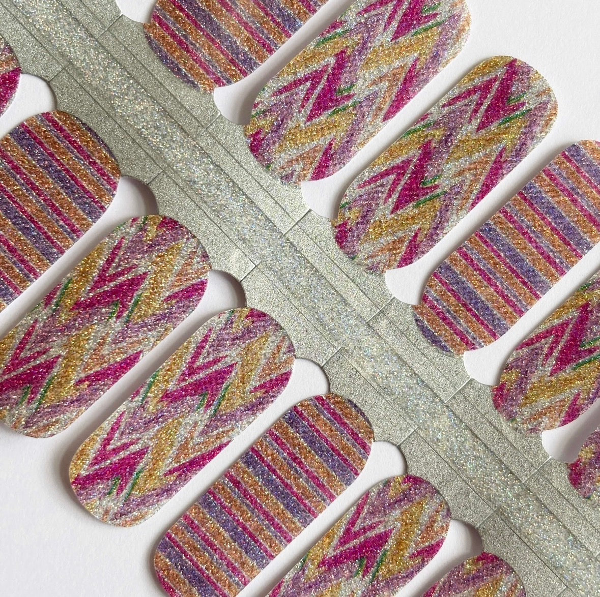 A sparkly pink and purple patterned nail polish strip. Suitable for natural, shellac, acrylic, and gel nails. 100% real nail polish, non-toxic, vegan friendly, and cruelty-free.