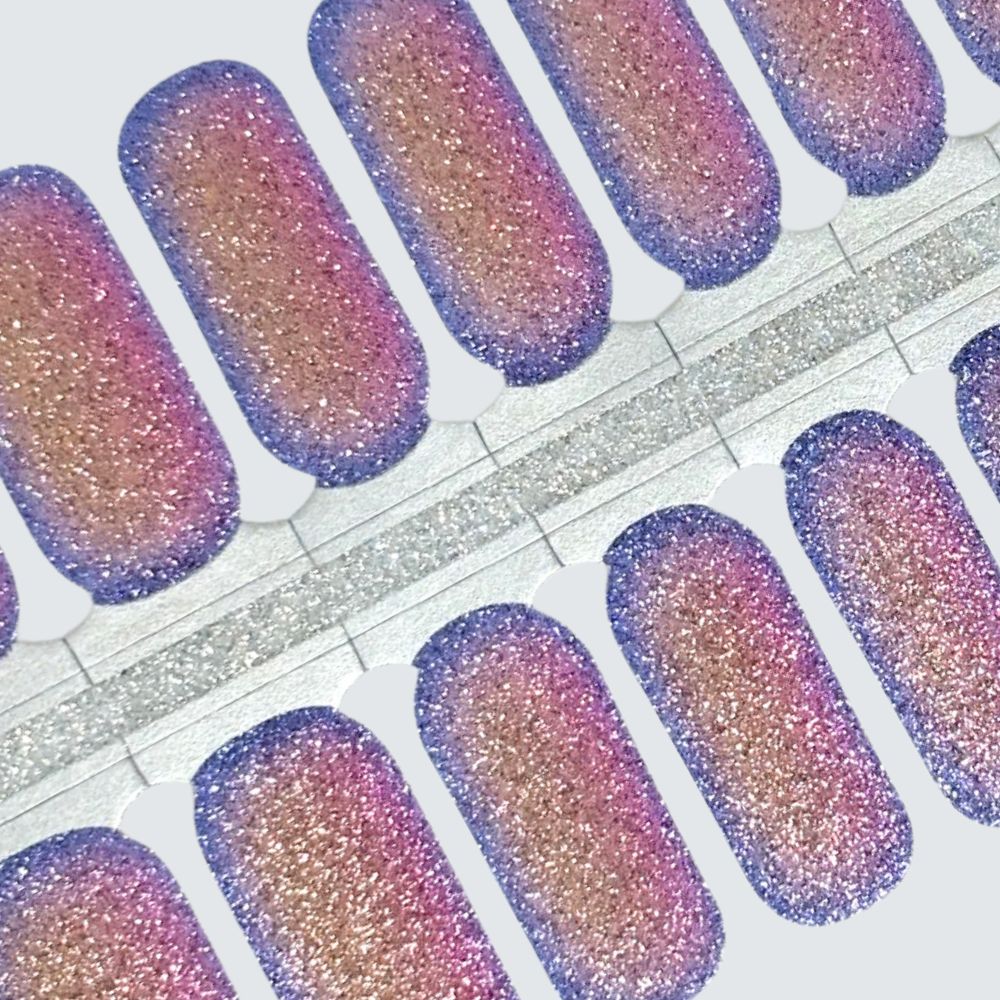 A stunning pink and purple ombre sparkly nail polish strip. Suitable for natural, shellac, acrylic, and gel nails. 100% real nail polish, non-toxic, vegan friendly, and cruelty-free.
