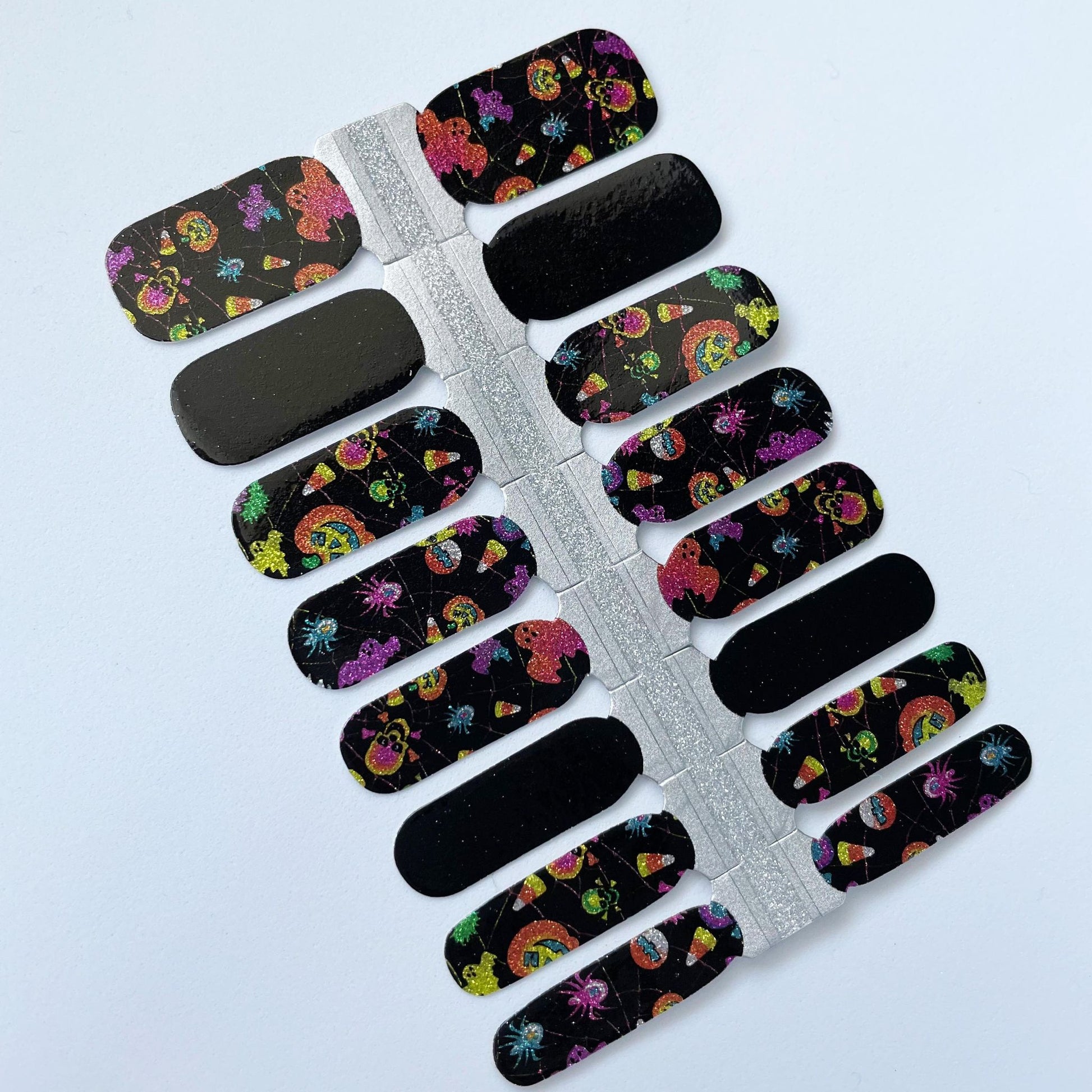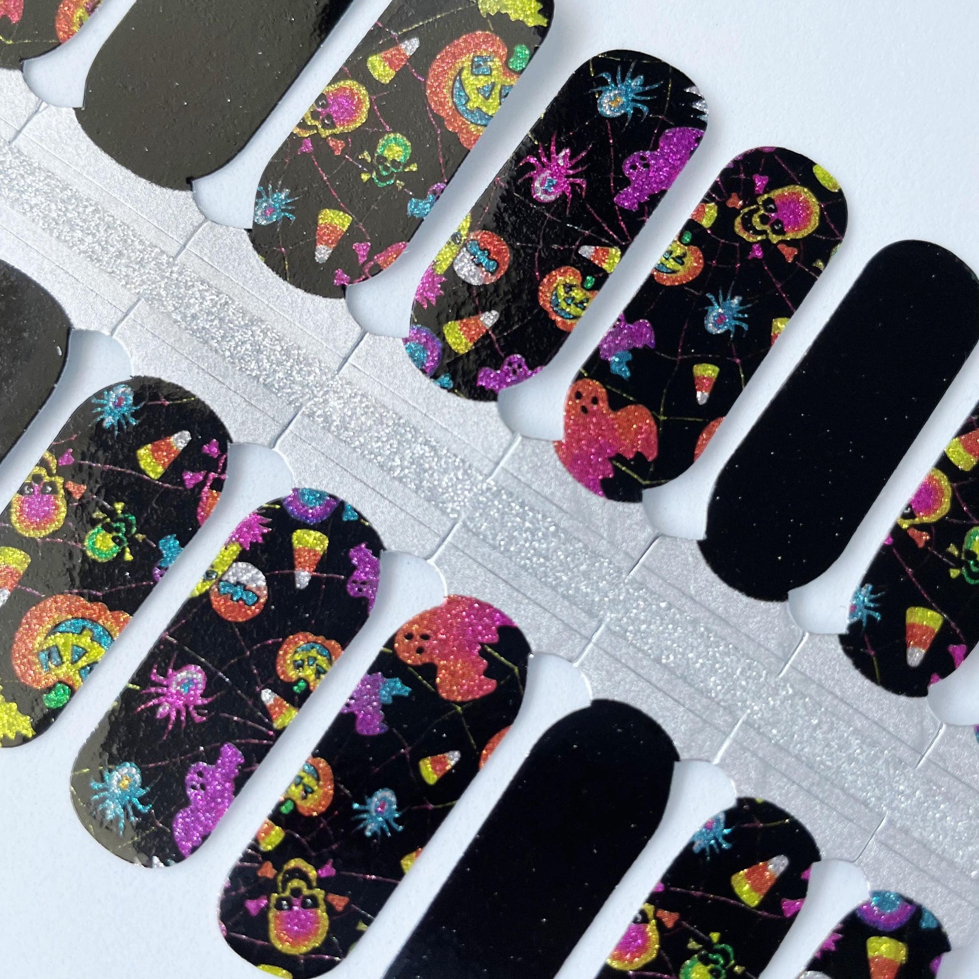 A solid glossy and glitter mixed mani design nail polish strip perfect for Halloween. Suitable for natural, shellac, acrylic, and gel nails. 100% real nail polish, non-toxic, vegan friendly, and cruelty-free.