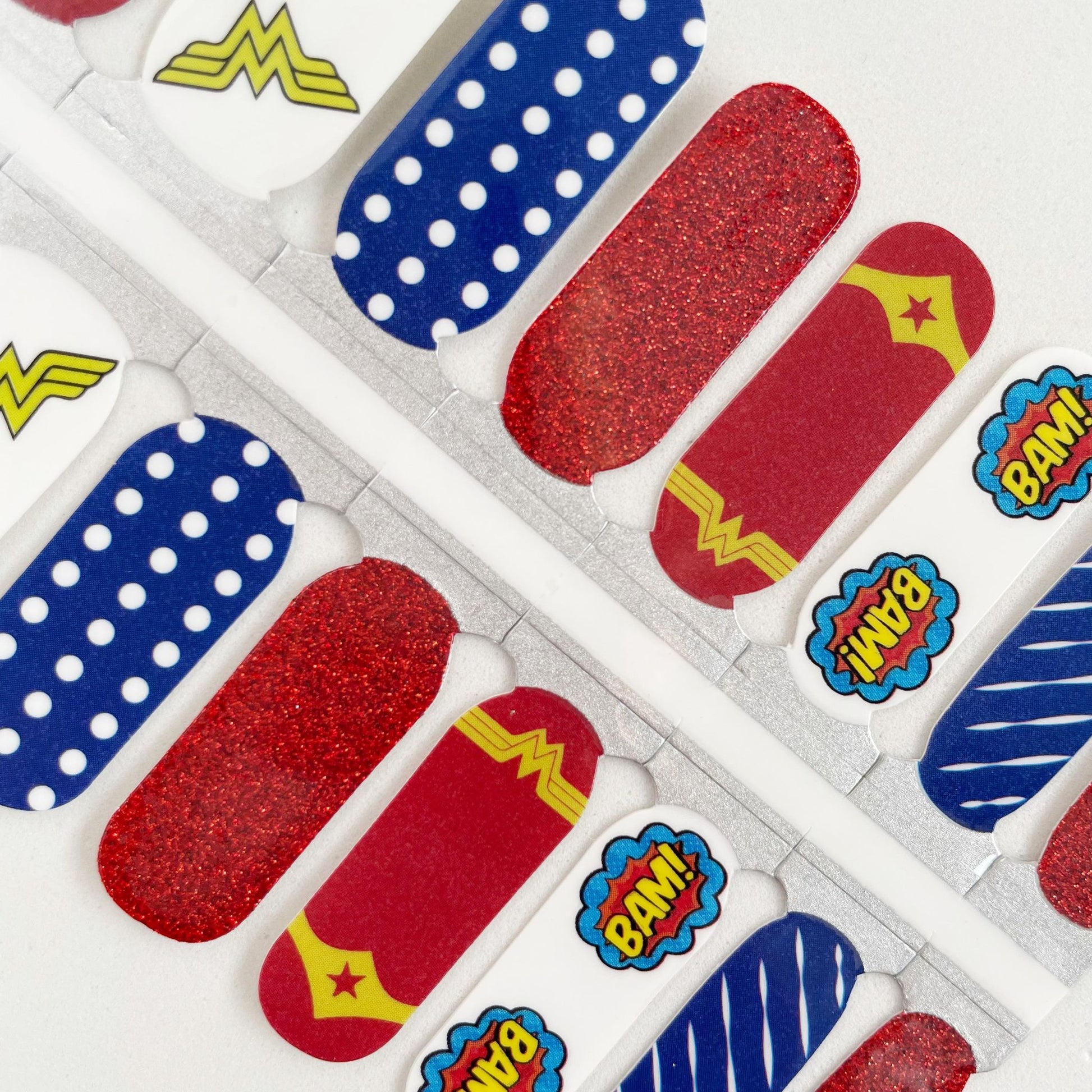 A glossy nail strip featuring your favourite female super hero! Suitable for natural, shellac, acrylic, and gel nails. 100% real nail polish, non-toxic, vegan friendly, and cruelty-free.